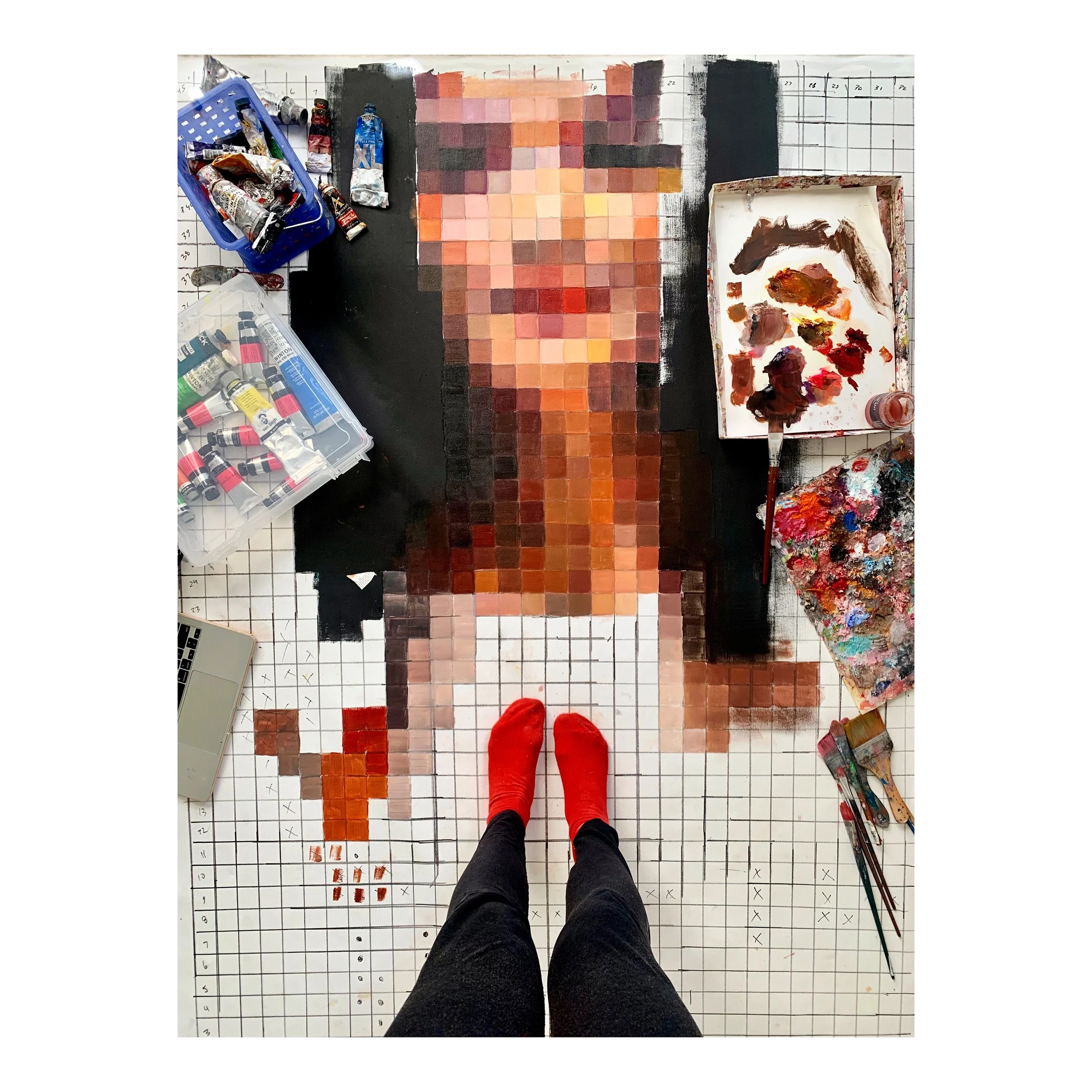 A picture is worth a thousand⬛️⬜️🟨🟧Creating a pixilation-style painting is a tedious process: technical, time consuming and requires a finely attuned eye for different color hues than regular brush stroke paintings. Just prepping the canvas is a mini project in itself. The art of mosaic/pixelation is the rewardings of its details from afar—the inverse of most traditional paintings where appreciation is upclose.