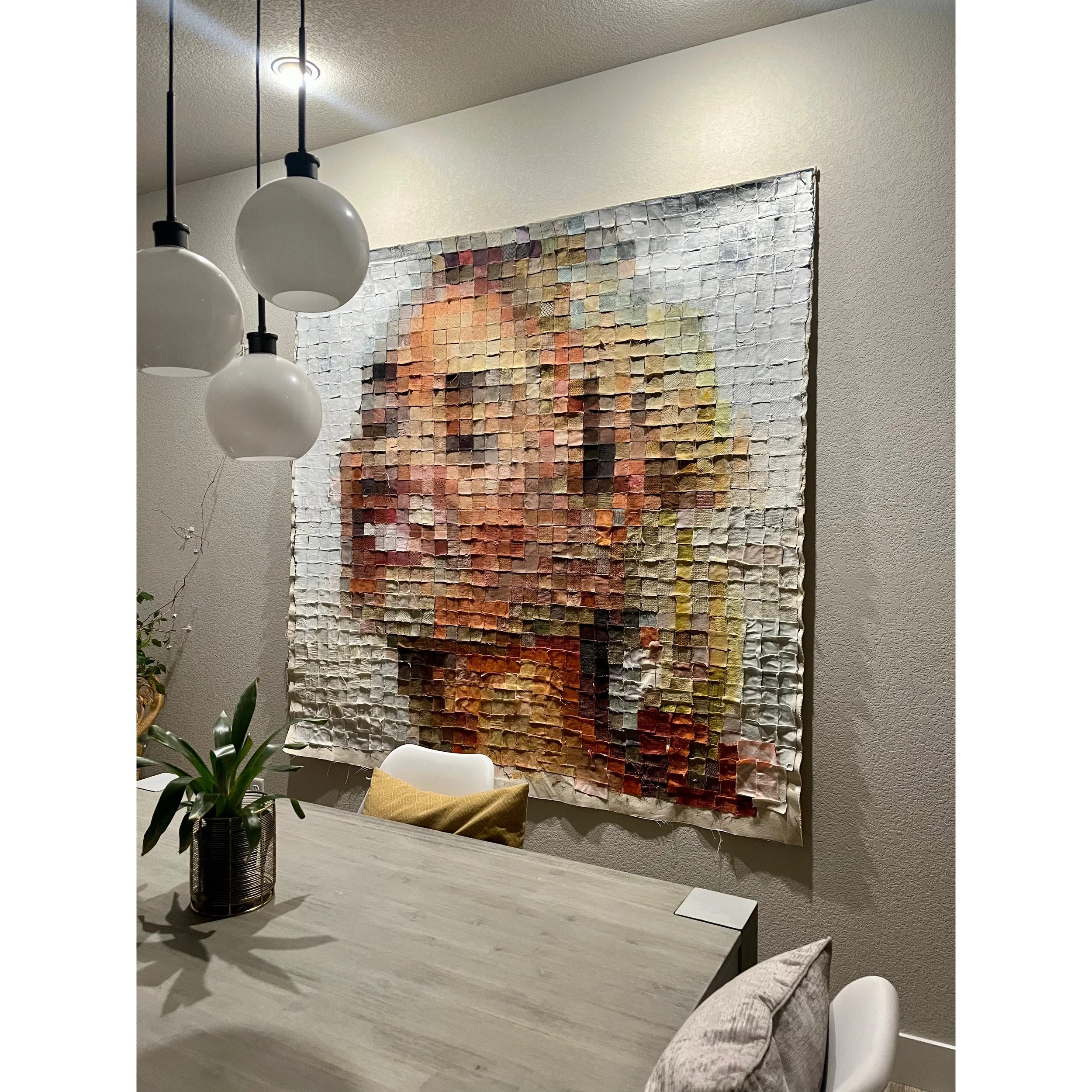 “BLONDES HAVE MORE FUN (Part 2)” 6x6’ painting on cut fabric squares //// I walked into @denverdesigndistrict last month and they bestowed on me 4 boxes of recycled fabric samples that I thought I would experiment with! It’s part of my pixilated collection but my limited color palette (and tattered edges of fabric) offset the clean realism I was going for as it turned into a more gruff abstract portrait—it’s a dual effect and that’s kinda cool! This project was taxing but exciting (especially when I finally finished it lol). Interested in buying this one-off over-size piece? DM me!💎 #whitneylanderson #jessicahart#denverdesign #denverdesigndistrict